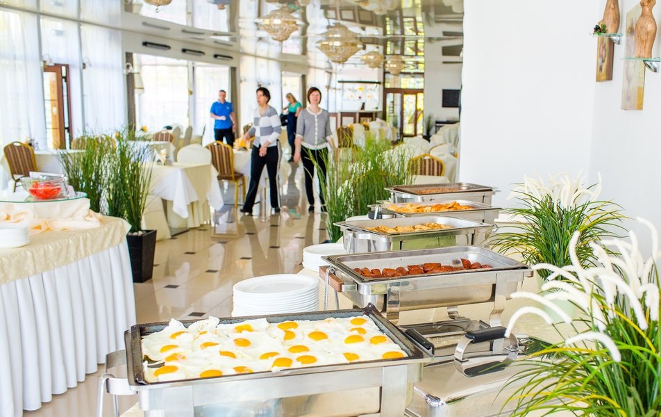 Обслуживание в ресторане отеля — пансионата возможно в двух форматах: по системе «Шведский стол» и согласно меню a la carte. Забронировать проживание можно по тарифу «Завтрак» или «Полный пансион» (3х-разовое питание).