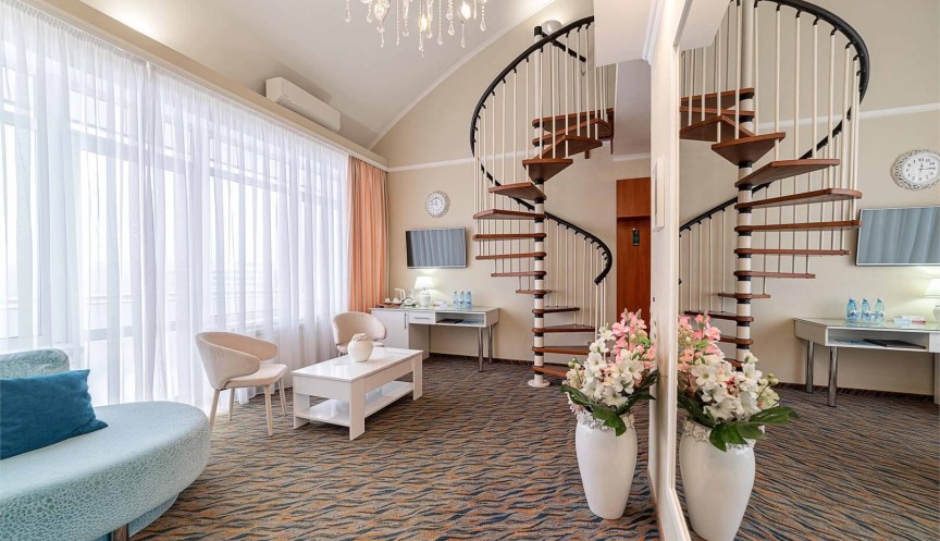 Номера для молодоженов, а также для тех, кто хочет провести романтический вечер вдвоем, с просторной и уютной спальней и гостевой комнатой на втором этаже. Расположен на 7 этаже.