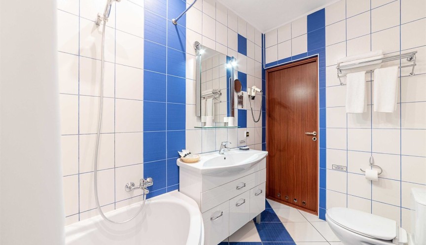 Две ванных комнаты (большая ванная, унитаз, биде, косметическое зеркало, раковина, набор косметических принадлежностей, фен, комплект полотенец)