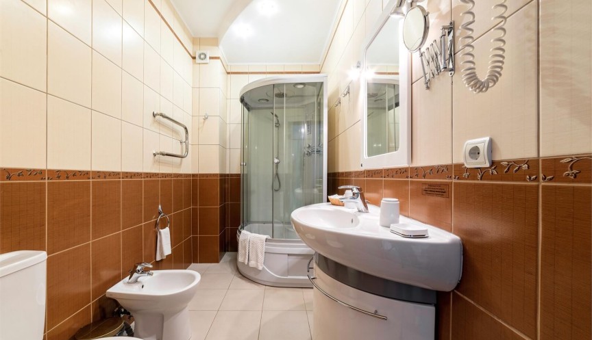 Собственная ванная комната (большая душевая кабина, унитаз, косметическое зеркало, раковина, набор косметических принадлежностей, фен, комплект полотенец)